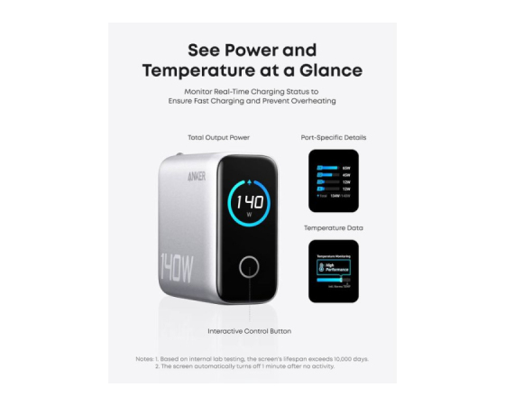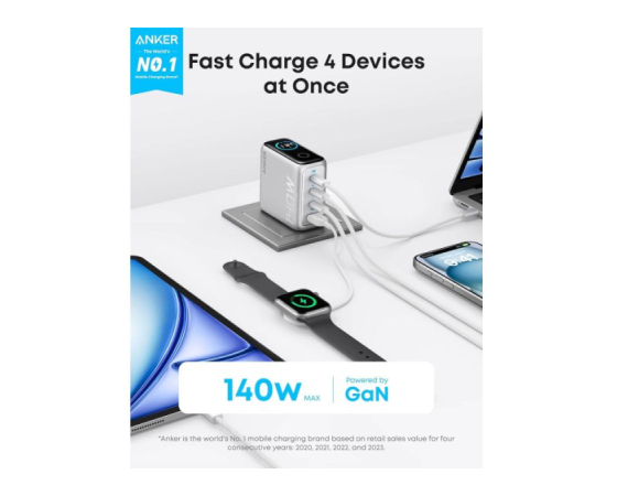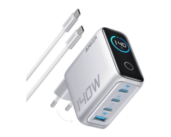 Anker polnilec (140 W, 4 priključki, PD 3.1), USB-C v USB-C kabel dolžine 1,5 m (240 W), uporabniški priročnik, 24-mesečno garancijo ter prijazno podporo za stranke.