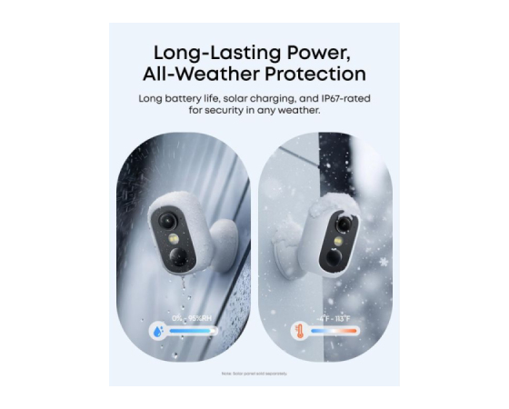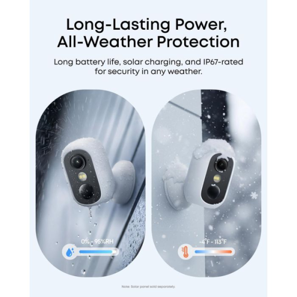 Brezžična in polnilna kamera podpira priklop na sončni panel eufy za neprekinjeno zaščito skozi vse leto.