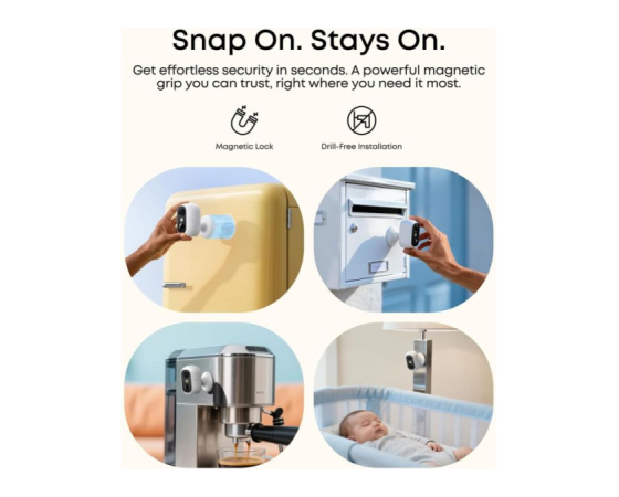 Namesti se v nekaj sekundah — magnetno pritrdite, obesite, privijte ali postavite na katerokoli ravno površino. Ta kompaktna, brezžična kamera je z zaščito IP67 odporna na vremenske vplive in primerna za notranjo in zunanjo uporabo.