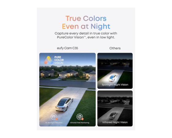 Uživajte v živih, realističnih slikah tudi pri šibki svetlobi. PureColor Vision™ omogoča jasno nočno spremljanje brez reflektorjev ali infrardeče svetlobe.