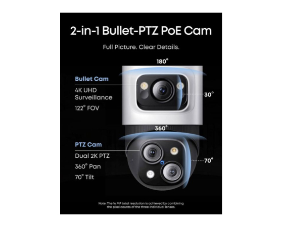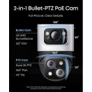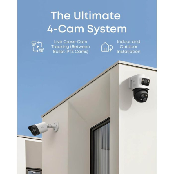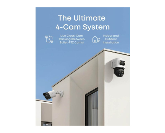 Popoln 4-kamerni sistem Zavarujte svojo lastnino z dvema 4K fiksnima kamerama za nadzor območij in dvema PTZ kamerama za 4K širokokotni pregled, skupaj s 2K PTZ kamero s 360° vrtenjem in 8× povečavo za aktivno sledenje. AI-ISP zagotavlja živahen barvni nočni vid brez potrebe po reflektorjih.