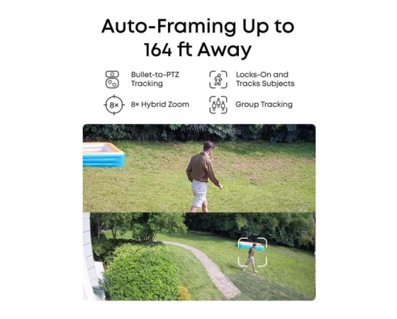 Samodejno kadriranje in sledenje skupinam Ko kamera zazna osebo, se PTZ zaklene nanjo in jo samodejno sledi z ostrimi bližnjimi posnetki do razdalje 50 m. Samodejna povečava ohranja subjekte v kadru, dokler ne zapustijo vidnega polja.