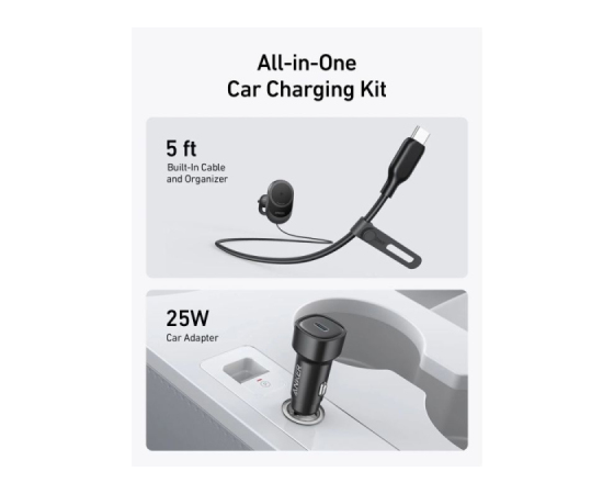 Pripravljeni na vožnjo: Komplet za polnjenje v avtomobilu vključuje 1,5 m (5 ft) vgrajen USB-C kabel, organizator kablov in močan 25W adapter.