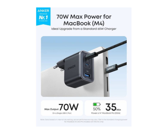 Napajajte svoj MacBook z resnično močjo 70 W: Vsak USB-C priključek zagotavlja do 70 W moči — dovolj za polnjenje 14-palčnega MacBook Pro (2024) od 0 do 50 % v 35 minutah. V primerjavi s standardnim 65 W polnilnikom omogoča hitrejše delovanje in boljšo združljivost z najnovejšimi modeli M4.