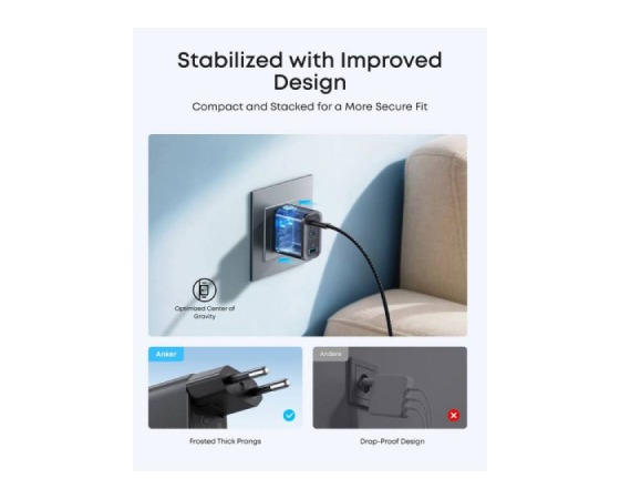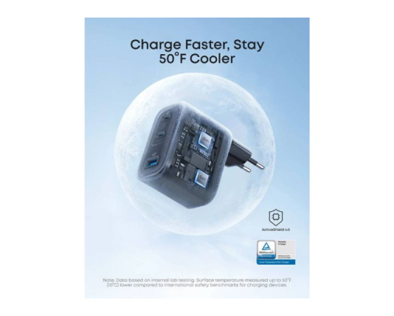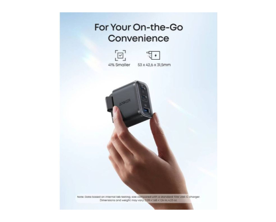 Mini velikost, idealna za potovanja: Z merami le 5,3 × 4,3 × 3,1 cm je polnilnik za 41 % manjši od običajnega 70 W USB-C polnilnika — zato je izjemno prenosljiv. Brez težav ga pospravite v žep, torbico ali potovalni etui in ostanete napolnjeni kjerkoli.