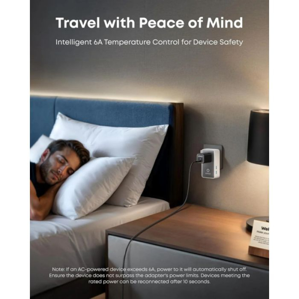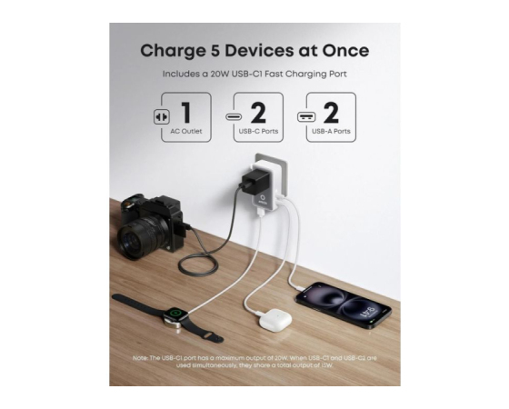 Napajajte 5 naprav hkrati: Polnite pet naprav istočasno prek AC-vtičnice, dveh USB-A priključkov in dveh USB-C priključkov, pri čemer eden omogoča 20 W hitro polnjenje, da vse ostane učinkovito napajano. iPhone 16 lahko napolnite do 50 % v samo 28 minutah.