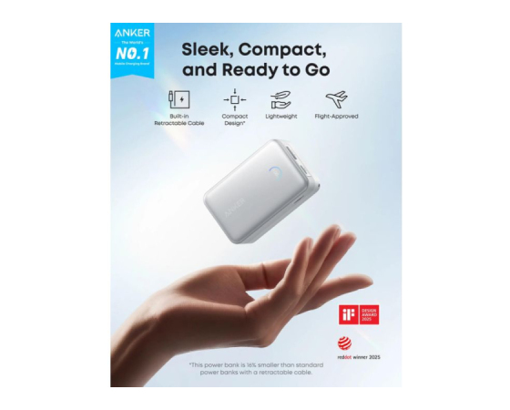 Oblikovan za življenje na poti, je ta power bank za 16 % manjši od standardnih modelov z izvlečnim kablom, kar olajša prenašanje. Poleg tega je odobren za letalske prevoze.