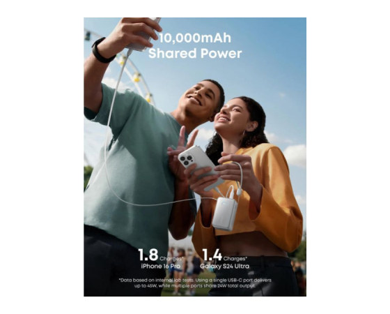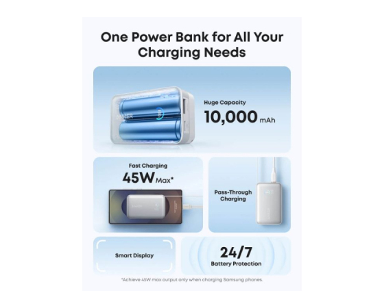 Opremljen z zmogljivo kapaciteto 10.000 mAh, hitrim polnjenjem do 45 W, tehnologijo pass-through, pametnim zaslonom in 24/7 zaščito baterije za varno ter učinkovito polnjenje kadarkoli. USB-C kabel/priključek je združljiv s Samsung Fast Charging 2.0.