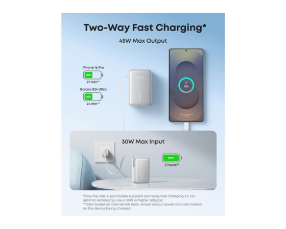Uživajte v sočasnem polnjenju naprav in ponovnem polnjenju power banka z največ 45 W izhodom (USB-C) za naprave in 30 W vhodom za hitro polnjenje power banka. iPhone 16 Pro napolni do 50 % v 27 minutah, power bank pa do 100 % v 2 urah.
