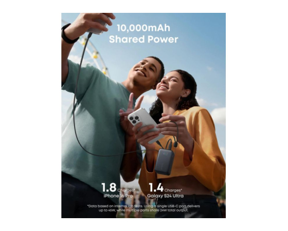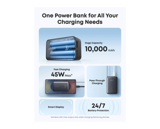 Opremljen z zmogljivo kapaciteto 10.000 mAh, hitrim polnjenjem do 45 W, tehnologijo pass-through, pametnim zaslonom in 24/7 zaščito baterije za varno ter učinkovito polnjenje kadarkoli. USB-C kabel/priključek je združljiv s Samsung Fast Charging 2.0.