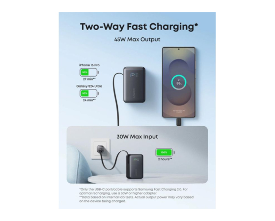 Uživajte v sočasnem polnjenju naprav in ponovnem polnjenju power banka z največ 45 W izhodom (USB-C) za naprave in 30 W vhodom za hitro polnjenje power banka. iPhone 16 Pro napolni do 50 % v 27 minutah, power bank pa do 100 % v 2 urah.