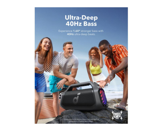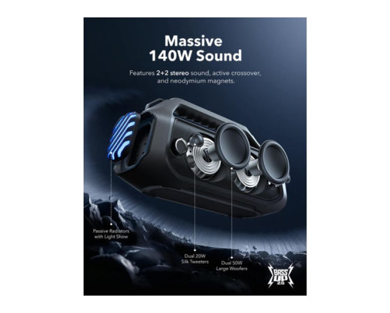 140W maksimalni bas: Občutite moč basa v vsaki pesmi z dvojnimi nizkotonci za globino in jasnost. Z BassUp️ 2.0 je izhod povečan s 100W na osupljivih 140W maksimalno - to je 160% več kot prva generacija BassUp.