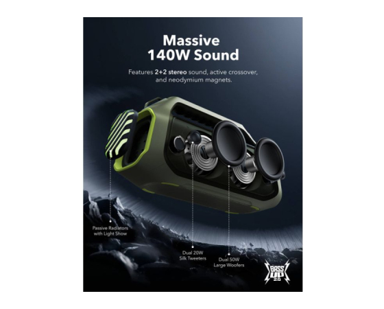 • 140W maksimalni bas: Občutite moč basa v vsaki pesmi z dvojnimi nizkotonci za globino in jasnost. Z BassUp️ 2.0 je izhod povečan s 100W na osupljivih 140W maksimalno - to je 160% več kot prva generacija BassUp.