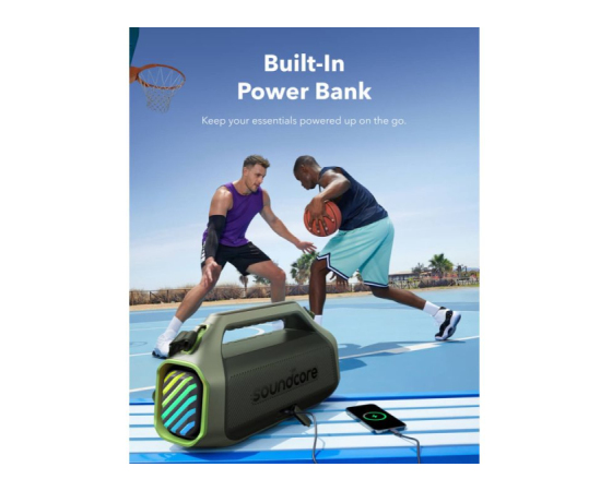 • 30W hitro polnjenje in vgrajena prenosna baterija: Združite z 30W polnilnikom, da popolnoma napolnite zunanji zvočnik Boom 2 Plus v samo 3 urah in predvajajte glasbo 20 ur. Z vgrajeno prenosno baterijo lahko napolnite telefon in druge potrebščine z 10W, kjerkoli ste. (Čas predvajanja se lahko razlikuje glede na raven glasnosti in vsebino predvajanja).