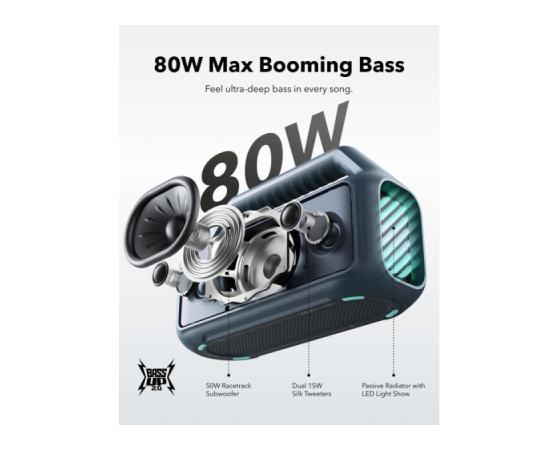 Občutite moč basa v vsaki pesmi zahvaljujoč nizkotonskemu zvočniku na dirkalni stezi za dodatno globino in jasnost. In z BassUp️ 2.0 lahko nastavite izenačevalnik nizkih tonov in povečate izhodno moč s 60 W na osupljivih največ 80 W.