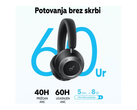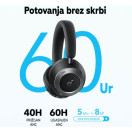 - Dolgotrajno poslušanje: Do 40 ur delovanja z aktivnim zmanjševanjem hrupa (ANC) in do 60 ur brez njega. Izjemno hitro polnjenje – 5 minut polnjenja omogoča do 8 ur poslušanja.
