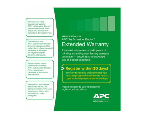 APC podaljšanje garancije za dodatna 3 leta. Namenjena je za podalšanje garancije novo kupljenih določenih APC UPSov. Pred nakupom nujno preverite na strani vašega UPSa, ali je ta garancija namenjena za vaš UPS!