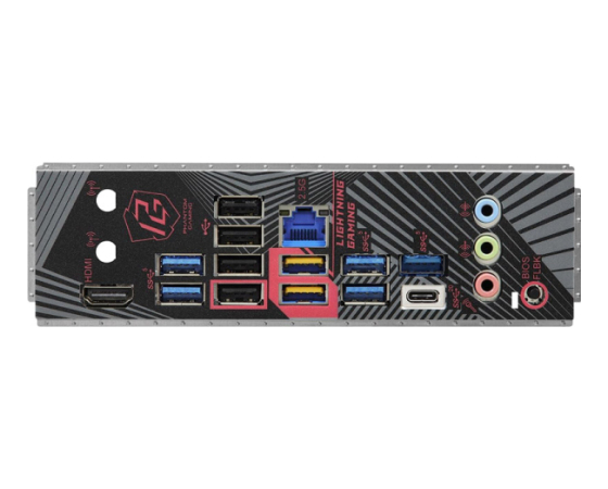| Zunanji konektorji: | 2x Antena 1x HDMI 1x USB 3.2 Gen2x2 Type-C (20 Gb/s) (ReDriver) 7x USB 3.2 Gen1 (USB32_34 Lightning Gaming Ports) (USB32_12 in USB32_56 ASMedia ASM1074 hub) 4x USB 2.0 1x RJ-45 LAN 1x BIOS Flashback gumb HD Audio Jacks: Line in / zvočnik spredaj / mikrofon |