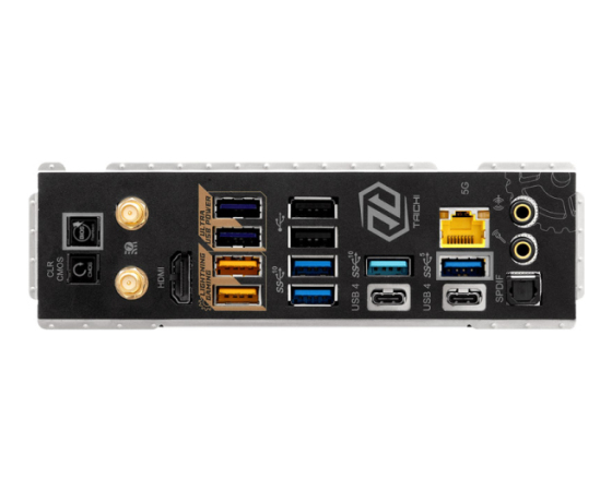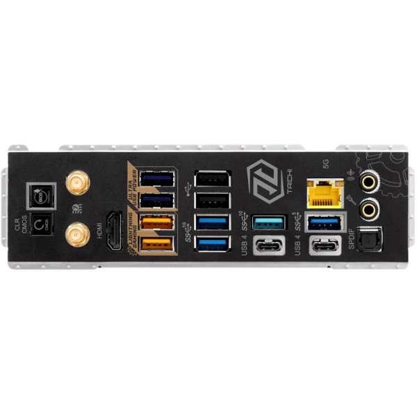 | Zunanji konektorji: | 2x antena 1x HDMI 1x SPDIF izhod 2x USB4 Type-C 5x USB 3.2 Gen2 Type-A (USB32_12 are Lightning Gaming Ports.) 3x USB 3.2 Gen1 Type-A (USB32_34 Ultra USB Power.) 2x USB 2.0 1x RJ-45 LAN 1x Clear CMOS 1x BIOS Flashback 1x Line izhod (Gold Audio Jack) 1x Mikrofon vhod (Gold Audio Jack) |