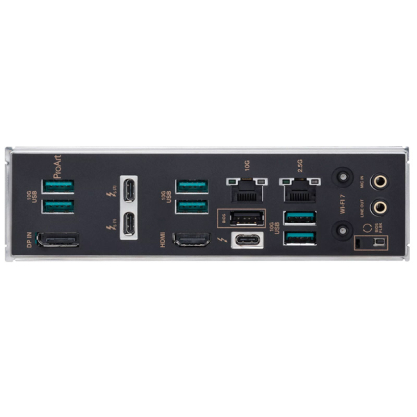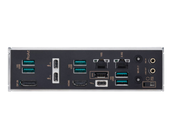 | Zunanji konektorji: | 2x Thunderbolt 5 USB Type-C 1x USB4 / Thunderbolt Type-C 6x USB 3.2 gen1 10Gbps Type-A 1x USB 2.0 1x DisplayPort (samo vhod) 1x HDMI 1x Wi-Fi modul 1x Marvell AQtion 10Gb 1x Intel 2.5Gb 2x Gold-plated audio jacks 1x BIOS FlashBack gumb |