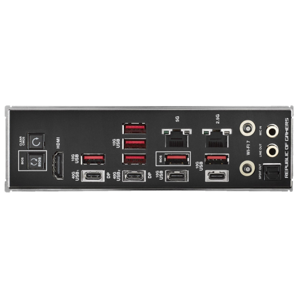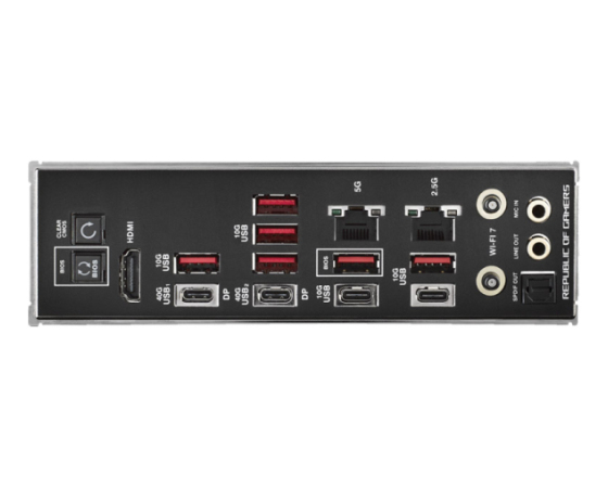 | Zunanji konektorji: | 2x USB4 (40Gbps) port (2x USB Type-C) 8x USB 10Gbps port (6x Type-A + 2x USB Type-C) 1x HDMI port 1x Wi-Fi modul 1x Intel 2.5Gb Ethernet 1x Realtek 5Gb Ethernet 2x Gold-plated audio jack 1x Optical S/PDIF izhod 1x BIOS FlashBack gumb 1x Clear CMOS gumb |