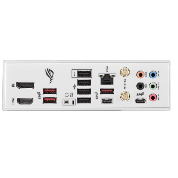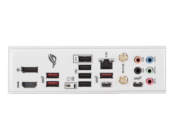 | Zunanji konektorji: | 1x USB 3.2 Gen 2x2 port (1 x USB Type-C®) 4x USB 3.2 Gen 2 ports (3 x Type-A + 1 x USB Type-C®) 4x USB 2.0 ports (4 x Type-A) 1x DisplayPort 1x HDMI® port 1x Wi-Fi Module 1x Intel® 2.5Gb Ethernet port 5x Audio jacks 1x BIOS FlashBack™ button |