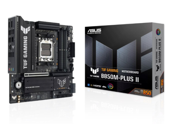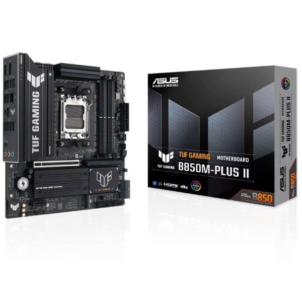 TUF GAMING B850M-PLUS II je matična plošča formata micro-ATX, zasnovana za uporabnike, ki želijo zanesljiv in vzdržljiv sistem na osnovi procesorjev AMD Ryzen serij 7000, 8000 in 9000. Plošča uporablja ojačane komponente, preverjene hladilne rešitve in stabilno napajalno zasnovo, kar zagotavlja zanesljivo delovanje pri igrah, ustvarjalnih opravilih in vsakodnevni rabi.