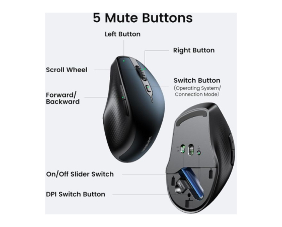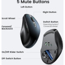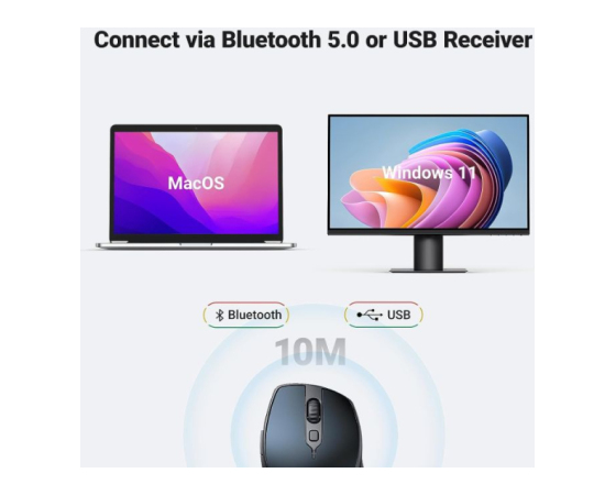 Brezžična miška Bluetooth UGREEN ponuja dva načina povezave: Bluetooth 5.0 in brezžično 2.4G; Podpira brezhibno preklapljanje med obema načinoma s preprostim pritiskom na gumb, kar odpravlja potrebo po ponavljajočih se povezavah. Za dodatno udobje ima podporo za pojavno okno za samodejno seznanjanje na WIN10 in novejšem