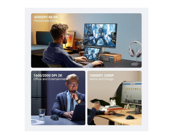 Bluetooth miška UGREEN ima odličen optični senzor in štiri nastavljive ravni DPI (1000/1600/2000/4000); Njegov natančen položaj omogoča gladko in natančno delovanje, zaradi česar je primeren za različna namizna okolja