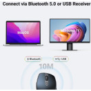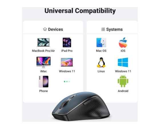 Ta brezžična miška podpira možnosti povezljivosti sprejemnika Bluetooth 5.0 in 2,4 GHz; Združljiv je s številnimi operacijskimi sistemi, vključno z Windows (7/8.1/10/11), macOS (10.15 in novejši), iOS (13.4 in novejši), Android (5.0 in novejši), ChromeOS in Linux