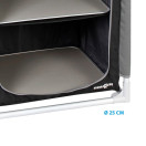 Tehnične informacijeVelikost v odprtem stanju 59 x 48 x V140 cmVelikost v zloženem stanju 42 x 11 x 69 cmTeža 6,3 kg -Tkanina 100% poliester