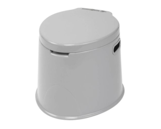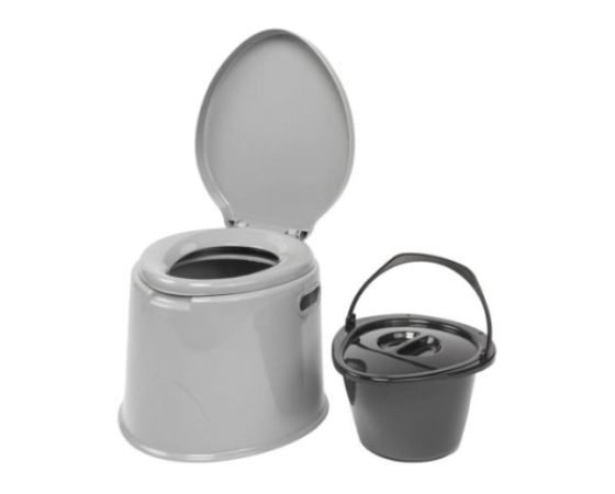 Moderno prenosno stranišče s sedežem, pokrovom in vedrom, ki se ločeno zaklepa.Tehnične informacije: