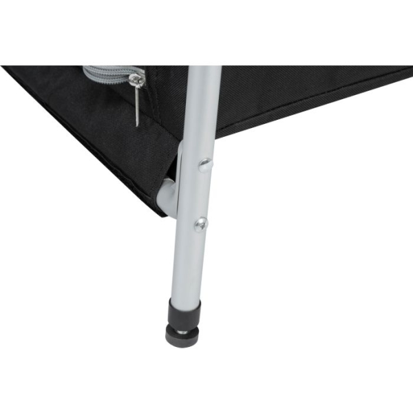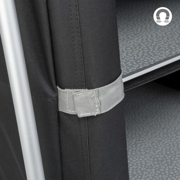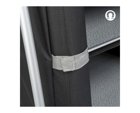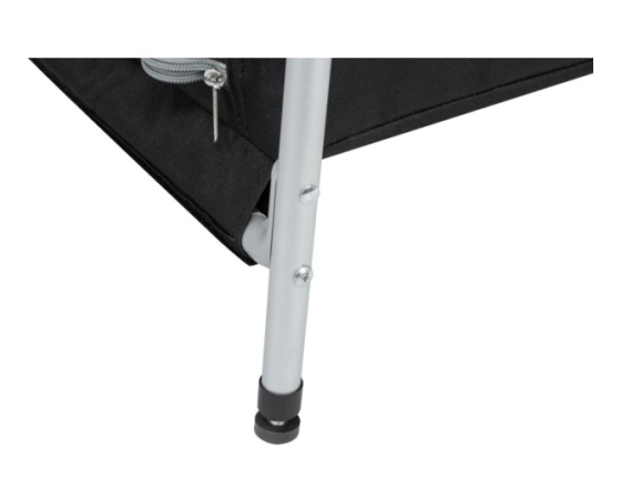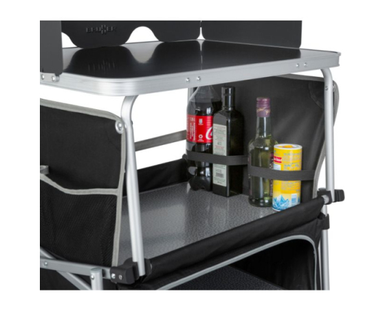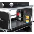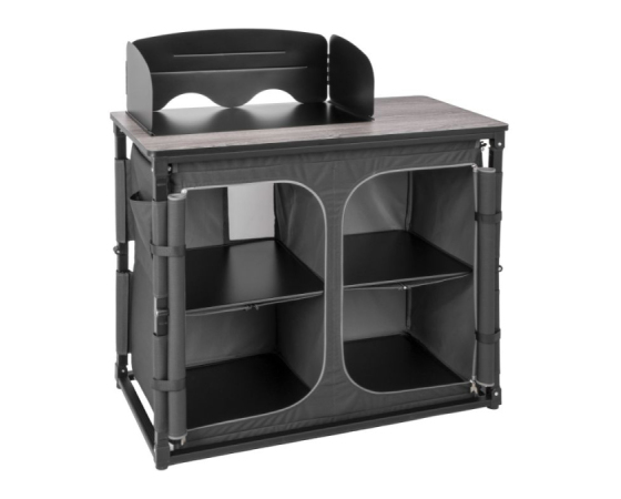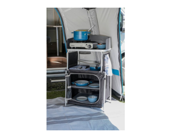 Kompaktna zložljiva kuhinjska omarica s toplotno odporno delovno površino, veliko prostora za shranjevanje, stranskimi žepi za kuhinjske pripomočke ter praktično kovinsko zaščito proti vetru in škropljenju. Idealna za manjše predšotore za počitniške prikolice in kombije. Priložena je praktična torba za prenašanje.