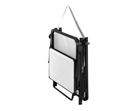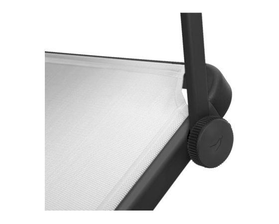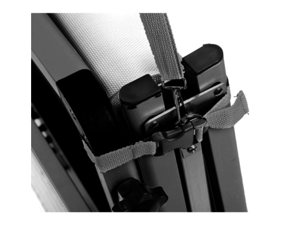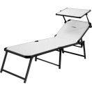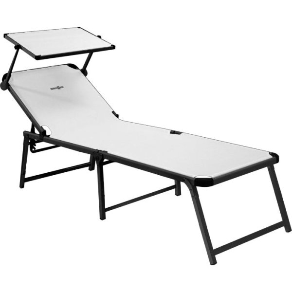 Zelo udobno ležišče s stabilnim, zložljivim okvirjem na treh nogah iz eloksiranega aluminija, visoko ležalno površino (V = 48 cm) iz tkanine Syntex Plus, odporne na vremenske vplive, in nastavljivim naslonom za hrbet. Dobavi je priložen praktičen nadstrešek za sončenje.