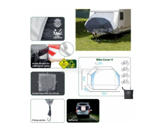 Prevleka za kolo iz vodoodbojne poliestrske tkanine. Z vgrajenim žepom za opozorilno tablico, ki odbija svetlobo.