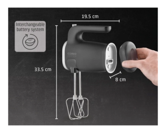 CASO Click & Mix izstopa z magnetnim izmenljivim baterijskim sistemom, ki omogoča neprimerljivo svobodo v kuhinji. Zmogljiva litij-ionska baterija (11,1 V, 2.000 mAh) je odstranljiva in združljiva z vsemi napravami iz serije »CASO Click-Series«. LED-prikaz stanja vas ves čas obvešča o napolnjenosti baterije, do 30 minut delovanja pa brez težav zadostuje tudi za večje kuhinjske projekte. Uživajte v brezžičnem, učinkovitem in prilagodljivem delu – brez kompromisov.