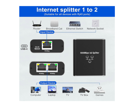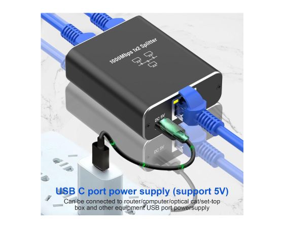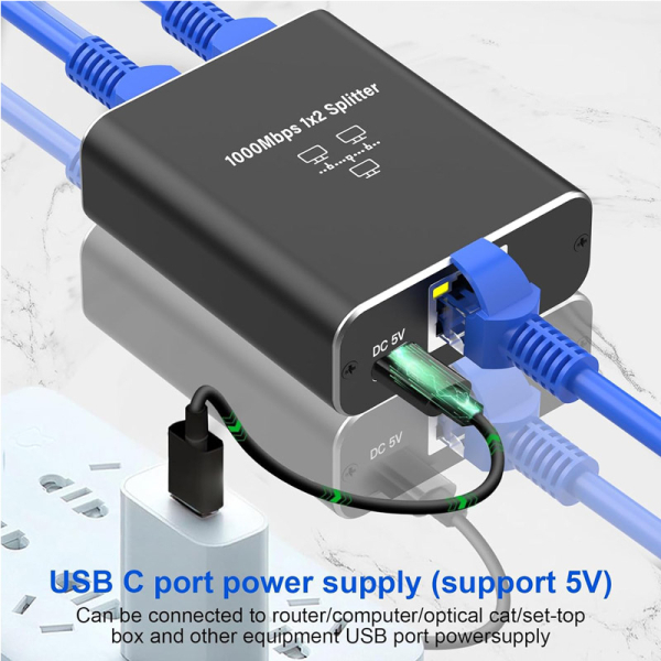 Napajanje prek USB-C: preprosto ga lahko priključite na računalnik. Lahko pa kot vir napajanja uporabite polnilnik z več vtičnicami ali nekaj, kar ima USB vtičnico (set-top box, power bank, TV itd.). (Opomba: 1000 Mbps Ethernet Splitter LAN Switch, to je največja hitrost, ki jo lahko doseže naprava; dejanska hitrost omrežja je odvisna od naprave, omrežnega kabla in drugih dejavnikov).