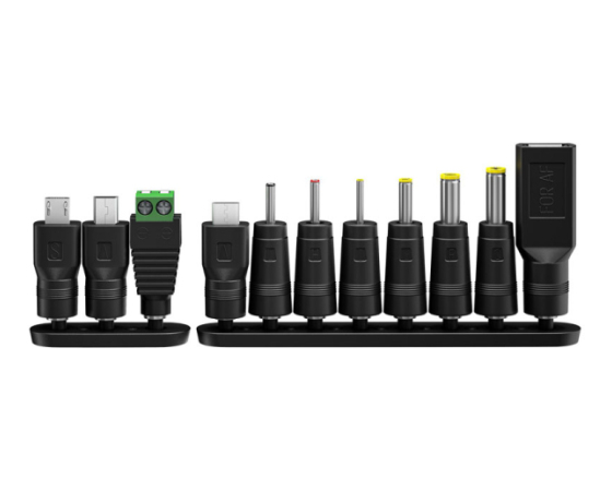 vklj. trajno pritrjen DC vtič 5,5 x 2,1 mm in 6 dodatnih DC adapterjev: 5,5 x 2,5 mm, 2,5 x 0,7 mm, 3,0 x 1,1 mm, 3,5 x 1,35 mm, 4,0 x 1,7 mm, 4,8 x 1,7 mm