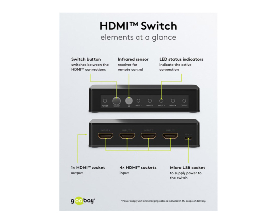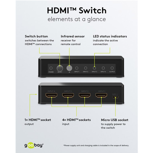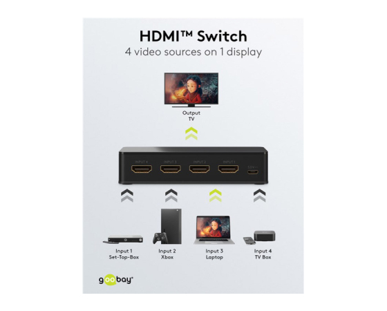 Stikalo HDMI omogoča hkratno povezovanje do 4x HDMI izvornih naprav z 1x HDMI izhodno napravo.