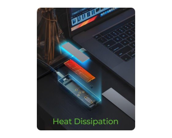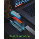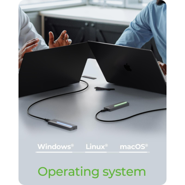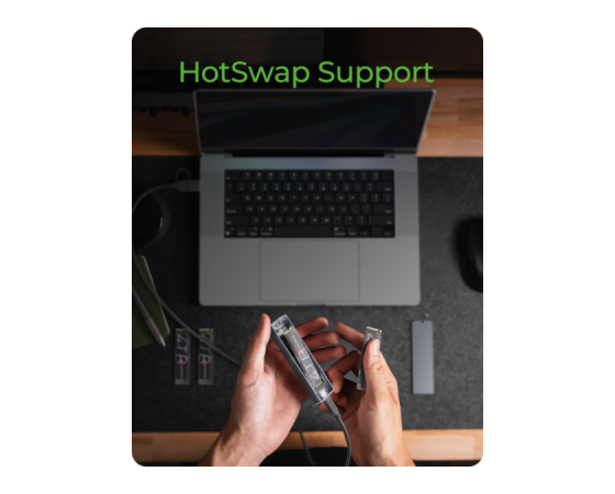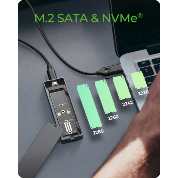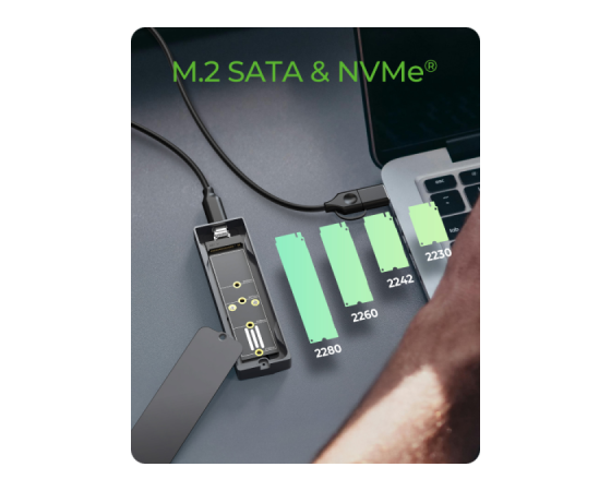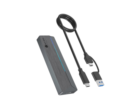 Ohišje podpira širok nabor M.2 formatov od 2230 do 2280 in je opremljeno z M-Key vtičnico, ki omogoča uporabo tako NVMe kot SATA SSD-jev. Povezava prek USB-C 3.2 Gen 2 zagotavlja hitrosti do 10 Gbit/s, priloženi 60 cm kombinirani USB-C/USB-A kabel pa omogoča uporabo z različnimi napravami. Za stabilno delovanje je vključen termalni pad, ki učinkovito odvaja toploto iz SSD-ja na ohišje. Podpora za HotSwap omogoča hitro menjavo SSD-jev brez izklopa sistema, kar je idealno za nadgradnje, varnostne kopije ali delo z več diski. Ohišje je združljivo z Windows, macOS in Linux, zato ga je mogoče vključiti v različna okolja brez dodatnih gonilnikov.