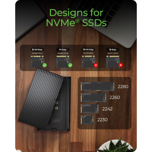 IB-1920M-C42 je visoko zmogljivo M.2 NVMe ohišje, zasnovano za uporabnike, ki potrebujejo izjemno hitro zunanje shranjevanje in zanesljivo zaščito podatkov. Z uporabo USB4 Gen 3x2 tehnologije omogoča hitrosti prenosa do 40 Gbit/s, kar je idealno za delo z velikimi datotekami, visoko ločljivostnimi mediji ali zahtevnimi tehničnimi delovnimi tokovi. Premikanje 10 GB datotek v nekaj sekundah omogoča učinkovito delo tudi pri zahtevah, kot je 8K montaža. Robustno aluminijasto ohišje ščiti SSD pred udarci in obrabo, hkrati pa učinkovito odvaja toploto. Vgrajen termalni pad neposredno prenaša toploto na ohišje, kar pomaga preprečiti segrevanje in ohranja stabilno delovanje tudi pri dolgotrajnih obremenitvah. Namestitev SSD-ja je povsem preprosta, saj ohišje omogoča hitro toolless odpiranje brez uporabe dodatnega orodja. Podpora za dolžine M.2 NVMe 2230, 2242, 2260 in 2280 omogoča uporabo širokega nabora pogonov brez potrebe po več različnih ohišjih. IB-1920M-C42 je združljiv s sistemoma macOS in Windows, kar zagotavlja brezhibno delovanje v različnih okoljih.
