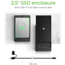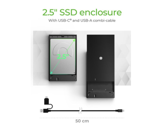Ohišje IB‑200T‑C3 omogoča hitre in preproste prenose podatkov z uporabo 2,5" SATA HDD ali SSD diska. Priložen USB režim s kombiniranim kablom (USB‑C in USB‑A) omogoča fleksibilnost priklopov glede na računalnik ali napravo. Zasnova brez uporabe orodja (Tool‑less) pomeni, da lahko disk vstavite brez vijakov ali orodij. Enosavno odprete ohišje, vstavite disk in zaprete. Pretok podatkov je do 5 Gb/s prek USB 3.2 Gen 1. Združljiv je z operacijskimi sistemi Windows, macOS in Chrome OS. Ohišje iz plastike v črni barvi, opremljeno z LED indikatorjem za napajanje in aktivnost diska.