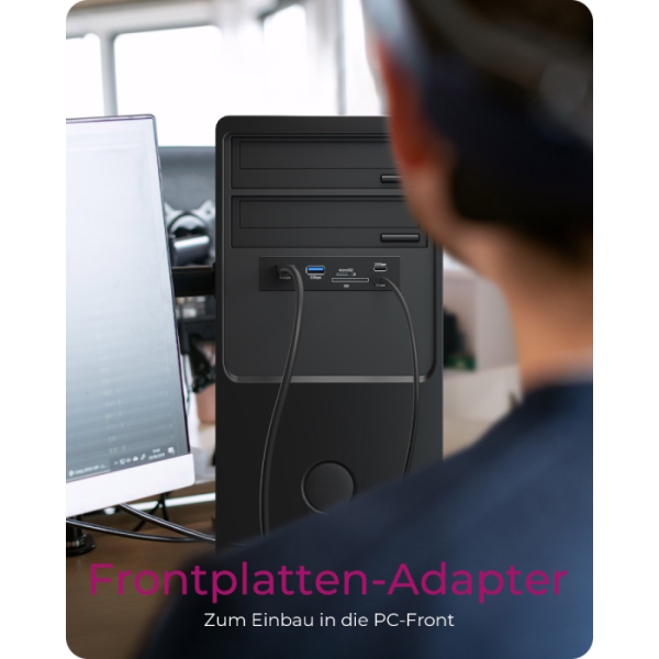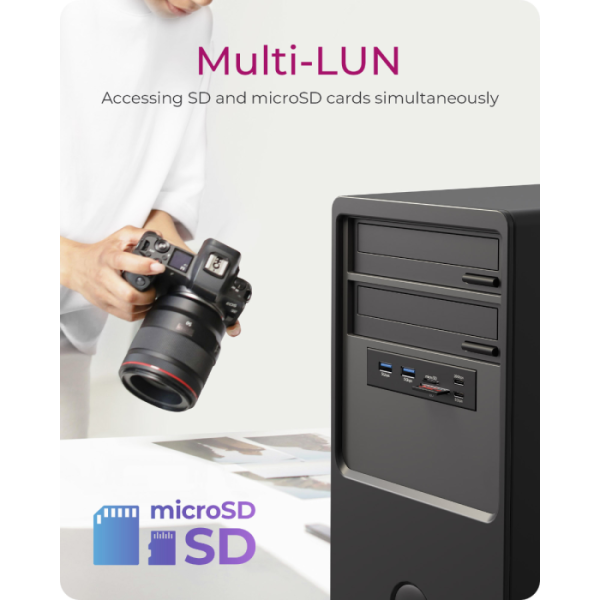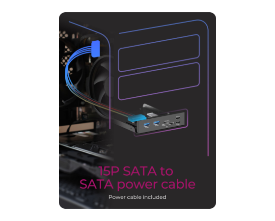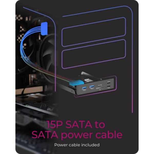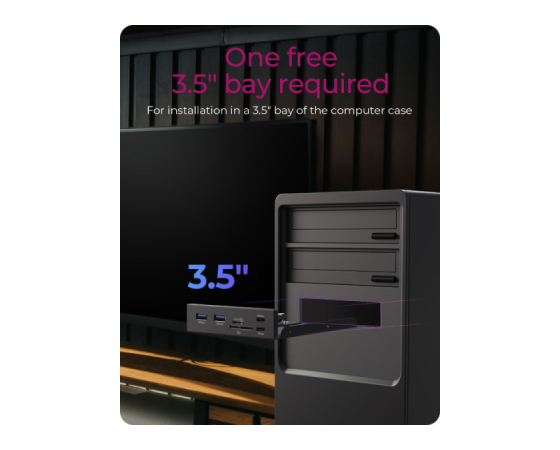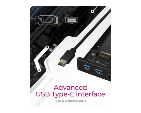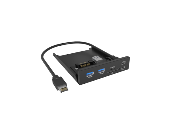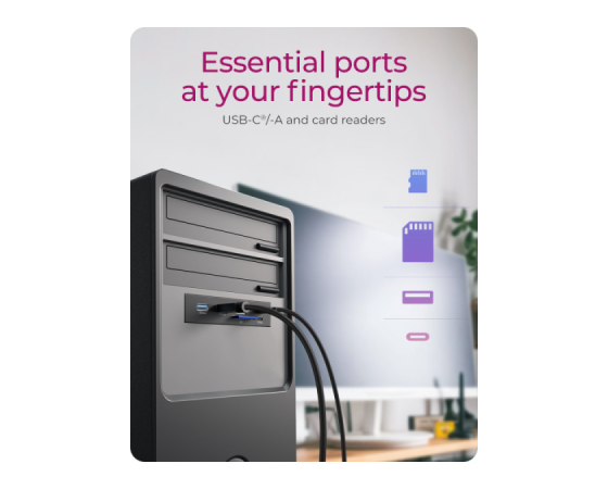 IcyBox IB-HUB1419-i3 je ohišje HUB za 3,5" režo v računalniki, ki bistveno izboljša dostopnost priključkov, saj najpogosteje uporabljene povezave prestavi neposredno na sprednji del ohišja. Tako ni več potrebe po poseganju po zadnjih USB vratih, kar prihrani čas in zmanjša obrabo priključkov na zadnji strani sistema. Ohišje ponuja širok nabor priključkov, vključno z USB-C (do 20 Gbit/s in 5 Gbit/s), USB-A (5 Gbit/s) ter dvojnim čitalnikom kartic za SD in microSD. S tem združuje več vrst povezav v eni kompaktni rešitvi. Z naprednim vmesnikom USB-E se IB-HUB1419-i3 neposredno poveže z matično ploščo in omogoča hitrosti prenosa podatkov do 20 Gbit/s. Ta sodoben priklop je zasnovan z mislijo na aktualne in prihodnje strojne standarde, zato predstavlja zanesljivo izbiro za uporabnike, ki potrebujejo hitro, stabilno in dolgoročno uporabno povezljivost.