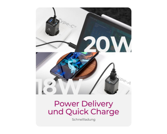 Omogoča hkratno polnjenje dveh naprav (USB-C + USB-A) pri skupni moči 20 W