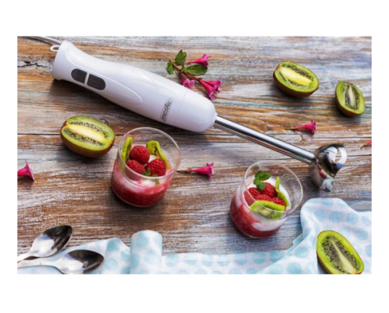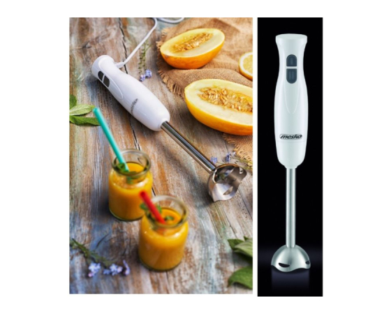 Napreden mešalnik, s katerim lahko preprosto pripravite okusno pito ali koktajl. Opremljen je z varčnim motorjem z največjo močjo 300 W in rezili iz nerjavečega jekla, ki zagotavljajo učinkovito in tiho uporabo. Je preprost za uporabo in čiščenje. Je tudi priročen, saj ima ergonomski ročaj. Možno je uporabiti 2 različni hitrosti mešanja.
