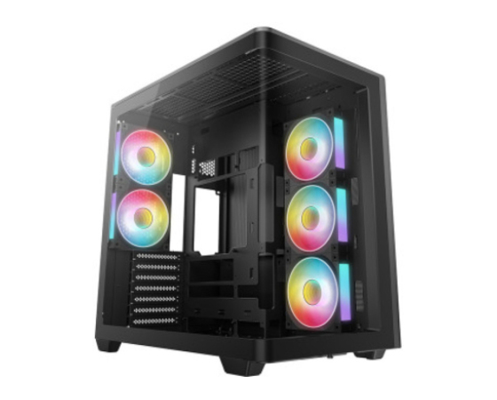 CG590U 5F ima dve zadnji reži za ventilatorje za učinkovitejše odvajanje toplega zraka. Predhodno so nameščeni trije ventilatorji 120 mm ARGB z obrnjenimi lopaticami na strani in dve standardni enoti zadaj, kar ustvarja močan horizontalni pretok.