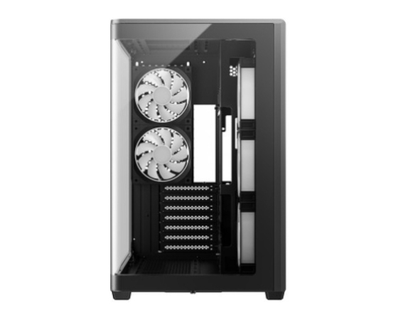 Zasnova z dvojno komoro loči napajalnik in diske v lastno cono hlajenja, kar ohranja prost vstop zraka do grafične kartice. Veliki mrežasti paneli na vrhu in strani izboljšajo zračenje po celotnem ohišju.