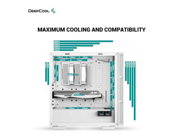 DeepCool CH560 DIGITAL WH. Faktor oblike: Midi Tower, Tip: PC, Barva izdelka: Bela. Postavitev napajalnika: Tla, Podprti faktorji oblike napajalnika: ATX, PS2. Nameščeni ventilatorji (spredaj): 3x 140 mm, Premer podprtih sprednjih ventilatorjev: 120.140 mm, Nameščeni ventilatorji zadaj: 1x 120 mm. Podprte velikosti trdih diskov: 2.5,3.5". Širina: 230 mm, Globina: 458 mm, Višina: 471 mm.
