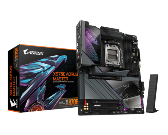 X870E AORUS MASTER ponuja napredno zasnovo VRM z 16+2+2 fazami in 110A Smart Power Stage, kar zagotavlja stabilno napajanje za procesorje AMD Ryzen. Napredno hlajenje VRM z AORUS LIGHTING in M.2 Thermal Guard XL poskrbi, da komponente ostanejo hladne tudi pod obremenitvijo.