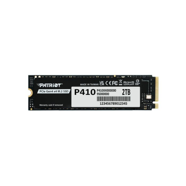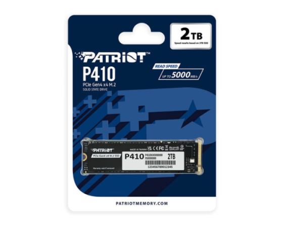 Patriot P410 2TB PCIe Gen4 x4 M.2 SSD je notranji SSD v formatu M.2 2280, namenjen nadgradnjam prenosnih in namiznih računalnikov. Podpira vmesnik PCIe Gen4 x4 in standard NVMe 1.4 ter omogoča sekvenčne hitrosti branja do 5.000 MB/s in pisanja do 4.500 MB/s. Zasnova je optimizirana za nizko porabo energije in učinkovito odvajanje toplote z uporabo tankega grafenskega toplotnega ščita. Podpora za Host Memory Buffer in tehnologija SmartECC prispevata k stabilnemu delovanju pri vsakodnevnih in zahtevnejših obremenitvah.